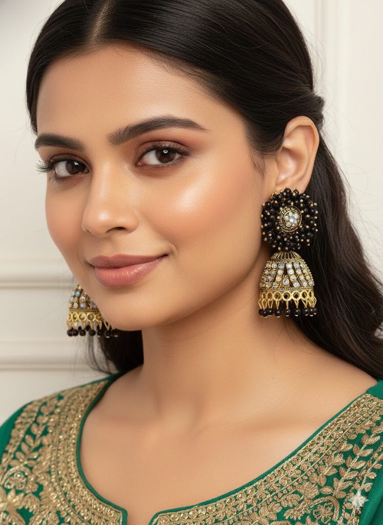 The floral stud top is beautifully adorned with black beads and shimmering stones, while the dome-shaped jhumka features multi-color crystal detailing and delicate hanging black bead drops. Lightweight yet eye-catching, these jhumkis are comfortable to wear for long hours and perfect for festive celebrations, parties, weddings, and traditional occasions.